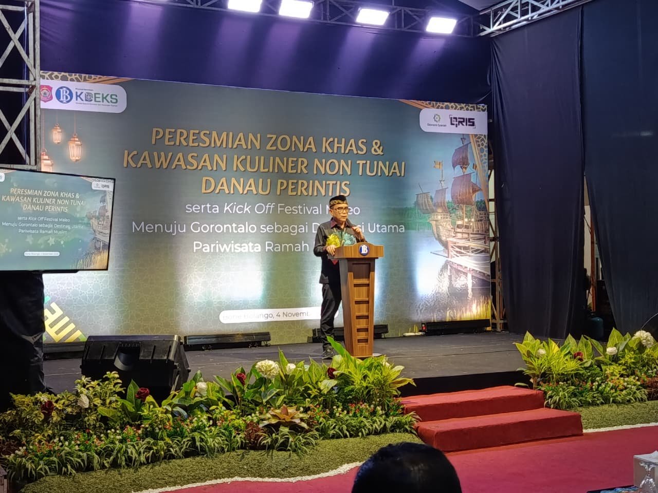 Kepala Kantor Perwakilan Bank Indonesia (BI) Provinsi Gorontalo, Bambang Setya Permana, saat memberikan sambutan pada persemian Zona KHAS (Halal, Aman, dan Sehat) sekaligus sebagai Kawasan Kuliner Non Tunai, Selasa (04/11/2025). Foto/Istimewa.