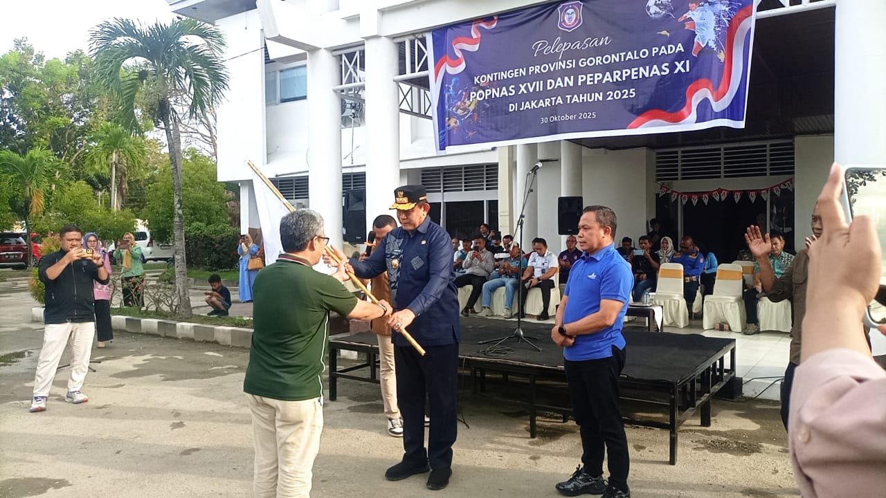 Gubernur Gorontalo, Gusnar Ismail di dampingi kepala dinas Dispora Provinsi Gorontalo, Danial Ibrahim, melepas kontingen yang akan mengikuti Pekan Olahraga Pelajar Nasional (POPNAS) XVII dan Pekan Paralimpik Pelajar Nasional (PEPARNAS) XI yang akan berlangsung di Jakarta, Kamis (30/10/2025). Foto/Inka Magang Diskominfotik Prov.