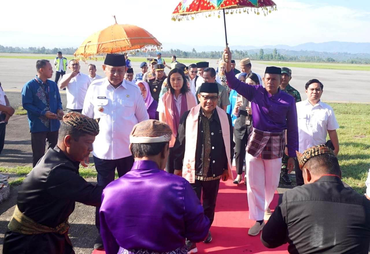 Menteri Koordinator Bidang Pemberdayaan Masyarakat (Menko PM) Republik Indonesia, Muhaimin Iskandar, tiba di Gorontalo pada Rabu (8/10/2025), disambut Adat Mopotilolo dan di dampingi Gubernur Gorontalo, Gusnar Ismail. Foto/Nova Didkominfotik Provinsi Gorontalo.