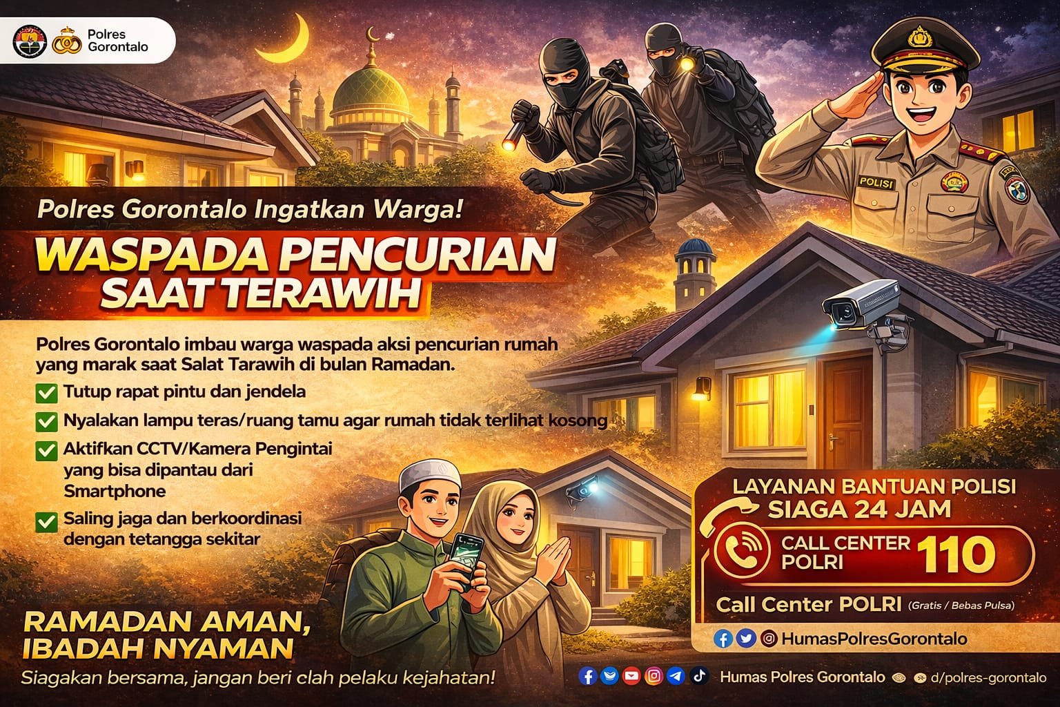 Mengantisipasi potensi pencurian rumah saat warga menjalankan ibadah, Polres Gorontalo mengeluarkan imbauan kewaspadaan kepada masyarakat.