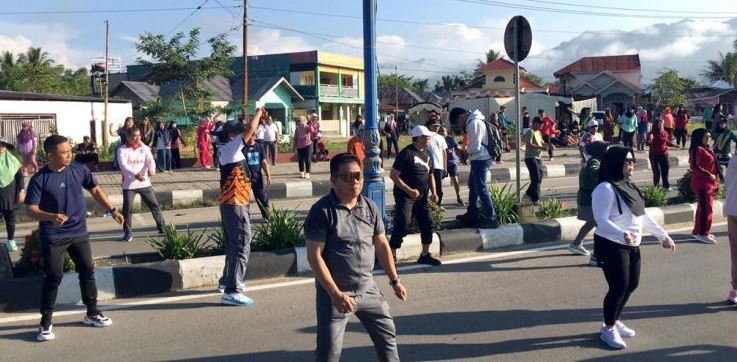 Setelah jalan sehat, kemeriahan berlanjut dengan sesi senam aerobik bersama. Irama musik cepat menggelegar, dan tanpa ragu, para pejabat seperti Wabup Risman dan rombongan ikut larut dalam gerakan yang energik, menularkan semangat kepada ribuan peserta, terutama para ibu-ibu.